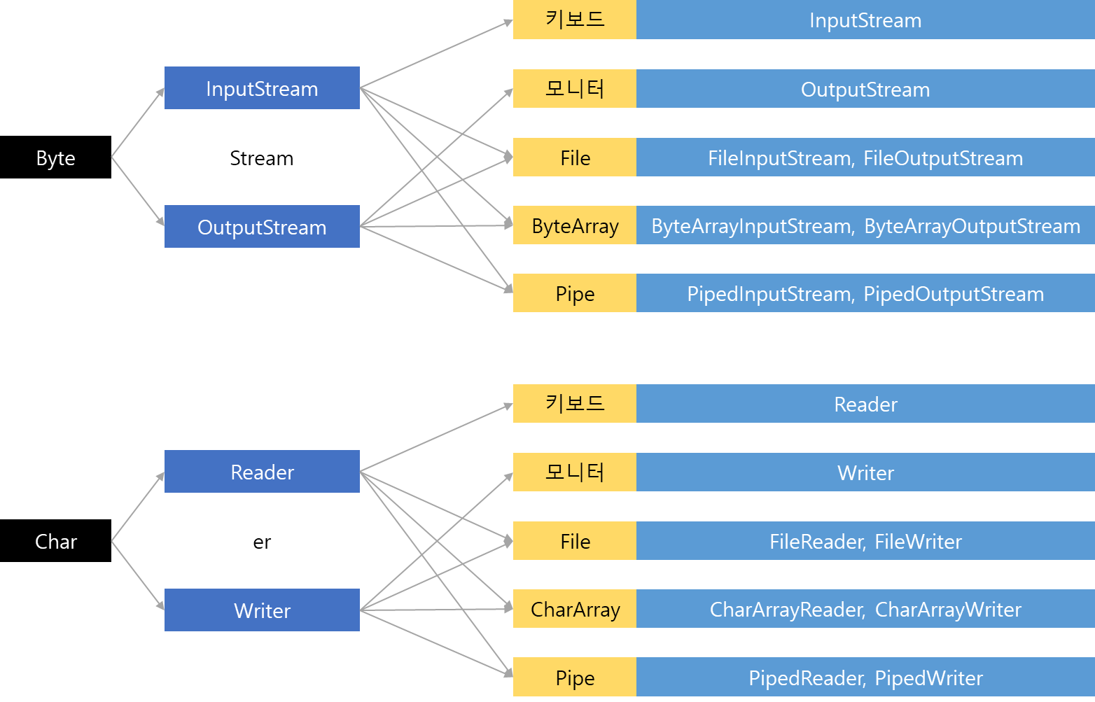 - 단방향으로만 통신이 가능하며 하나의 스트림으로 입출력을 같이 처리할 수 없음