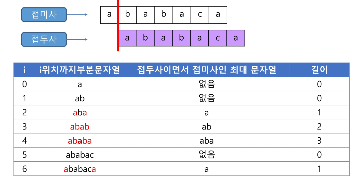 - pi[k] : 처음부터 k인덱스까지를 끝으로 하는 부분 문자열에서 일치하는 접두사와 접미사가 일치하는 최대 길이
